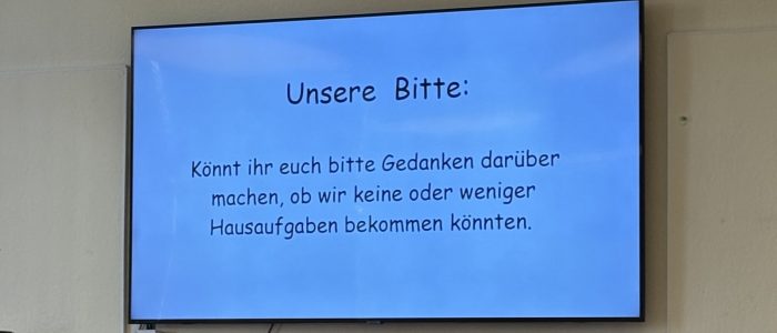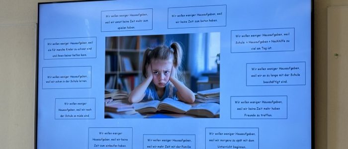 Ein Thema, welches vielen Schülerinnen und Schülern schon lange beschäftigt hat, war der Umfang der Hausaufgaben. Gemeinsam überlegten sie sich verschiedene Alternativen und sammelten Argumente, um sie den Lehrkräften und anderen Mitarbeitenden der Schule zu präsentieren. Am 20.03.2025 war es dann so weit: das Kinderparlament trat aufgeregt vor die Gesamtkonferenz und stellte das Anliegen mit einer vorbereiteten Präsentation vor.