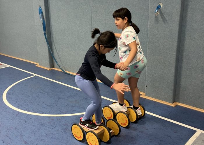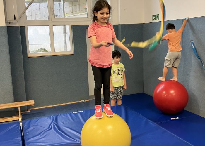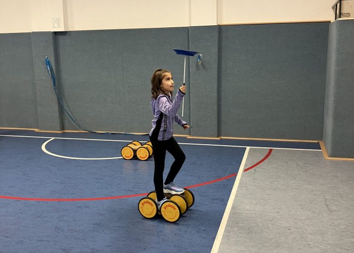 Gemeinsam wird der eigene Körper durch Pantomime besser kennengelernt, vorwärts und rückwärts gerollt oder mit Herausforderungen (Rolabola, Pedalos, etc.) der persönliche Horizont eines jeden Kindes erweitert.