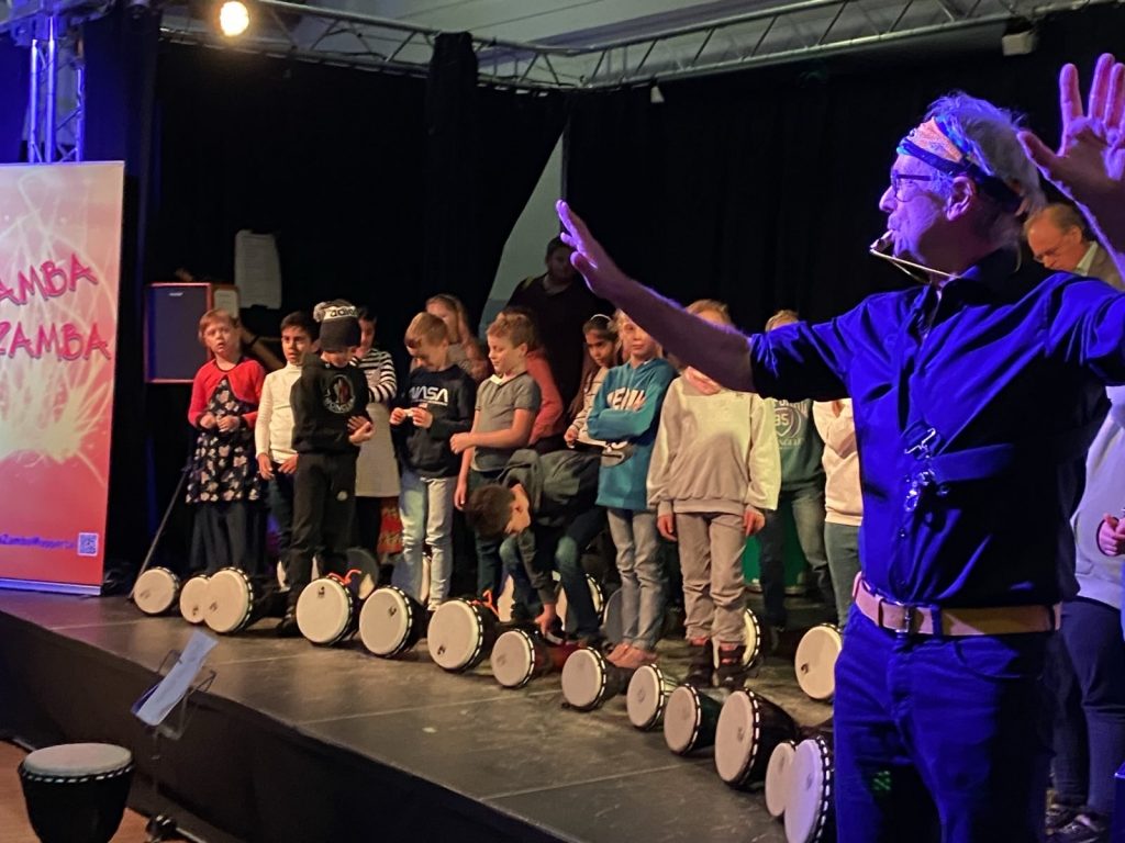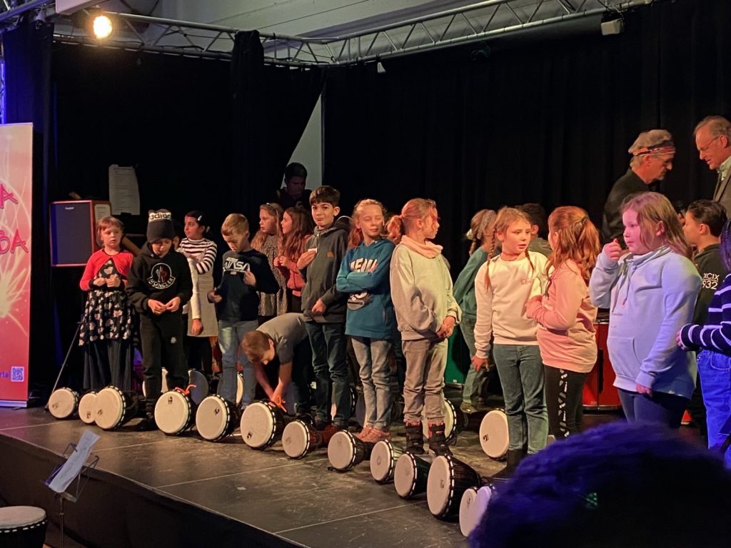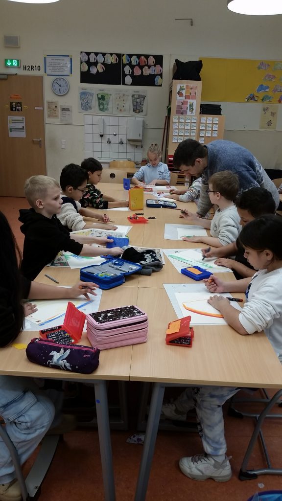 In der KuVo-Stunde („Kunst am Vormittag“) trommeln die Klassenleitungen sowie Kinder mit großer Freude in einem Sitzkreis. Die Stunde wird von dem Künstler Ralf Kunkel geleitet, der ebenso mitmacht. Durch das Trommeln entwickeln die Kinder ein besseres Rhythmusgefühl und fördern ihre Feinmotorik, Konzentrationsfähigkeit und Ausdauer. Auch soziale Kompetenzen werden gestärkt. Die Kinder lernen, aufeinander zu achten, sich in die Gruppe einzufügen und Rücksicht zu nehmen. Die KuVo-Stunde unterstützt darüber hinaus das Selbstbewusstsein, weil die Kinder ihre eigene kreative Ausdruckskraft entfalten dürfen. Eine wertvolle Ergänzung zum klassischen Schulalltag, in dem die Kinder nicht benotet werden.