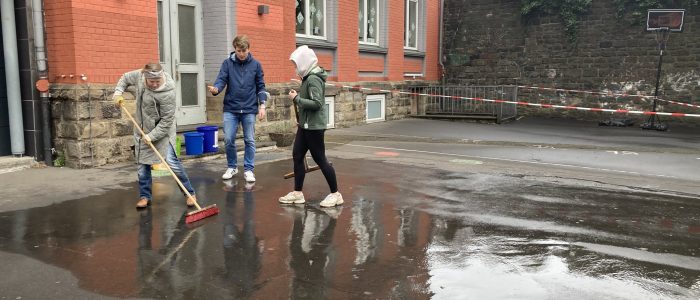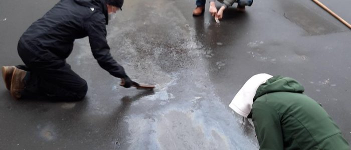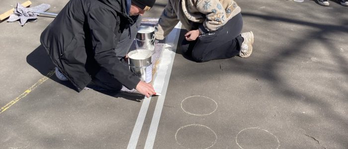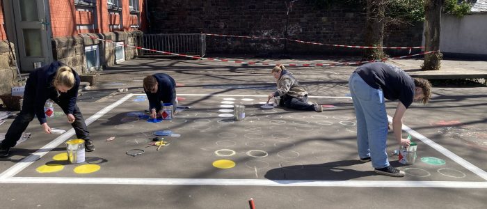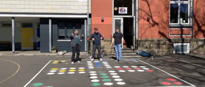 30.03.2025: Bei einstelligen Temperaturen, Wind und leichtem Regen säubern wir die Fläche, wo bald ein Mensch-ärgere-Dich-nicht-Feld entstehen soll. Zig alte Kaugummis müssen dafür abgekratzt und alte, brüchige Schulhofbemalungen werden mit chemischen Mitteln, Muskelkraft und maschinellen Mitteln so gut es geht entfernt. Nach etwas mehr als drei Stunden Arbeit wird die „Baustelle“ gesäubert und aufgeräumt. Das Ergebnis kann sich sehen lassen. So ist die Fläche vorbereitet, um am nächsten Wochenende bemalt zu werden.