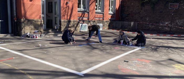 Um auf dem Schulhof neue Möglichkeiten zur Pausengestaltung zu bieten, hat sich das Kollegium viele Gedanken gemacht, was möglich und umsetzbar ist. Nach wochenlanger Vorbereitung stand nun alles für das Projekt „Neue Schulhofbemalung“ bereit.