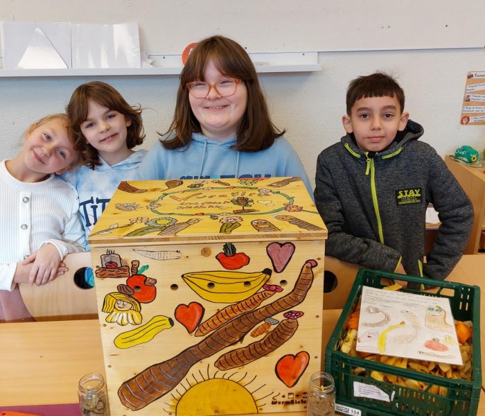 Die Würmer wohnen jetzt seit ein paar Monaten in der Kiste und bekommen die Abfälle und Reste unseres Schulobstes zu fressen. So entsteht für uns weniger Müll und gleichzeitig wird durch die Würmer super Komposterde hergestellt. Noch müssen die Würmer einiges futtern, aber bald können wir hoffentlich die erste Portion Erde „ernten“. Die wollen wir dann unserer Garten-AG spenden, damit sie damit schöne neue Blumen in unseren Schulgarten pflanzen kann.